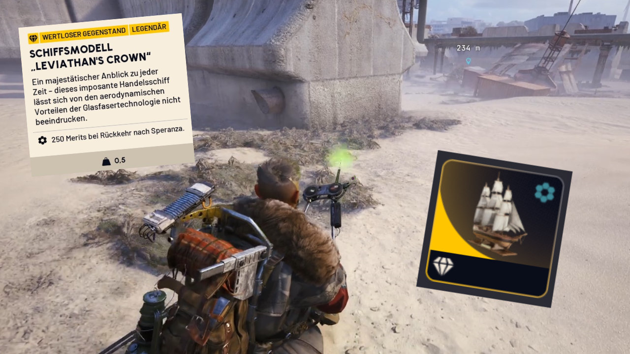 In manchen Koffern sind aber auch die Schiffsmodelle, die für das neue Projekt benötigt werden und die man obendrein als Wertobjekt verkaufen kann. Auf die hatte ich es jetzt besonders abgesehen und im Handumdrehen hatte ich eine Reihe verschiedener Modelle gesammelt. Ich konnte sogar ein goldenes Schiff namens „Leviathans Crown“ mein Eigen nennen.