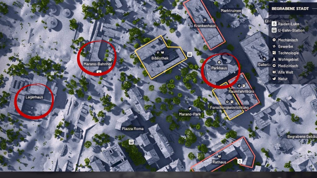 Aber auch die „Begrabene Stadt“ mit ihren vielen Autos und Generatoren eignet sich gut dafür. Lauft am besten eine Route von dem Lagerhaus im Westen, über den Marano-Bahnhof bis zum Parkhaus im Neuen Bezirk ab, je nachdem, auf welcher Seite ihr spawnt. Brecht auf dem Weg Autos auf und haltet Ausschau nach Containern und Generatoren, die ihr looten könnt.
