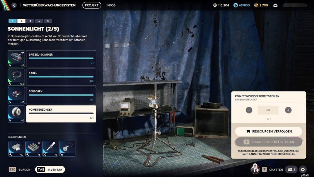 - Anforderung: 1x Spitzel-Scanner, 3x Kabel, 3x Sensoren, 1x Kometenzünder