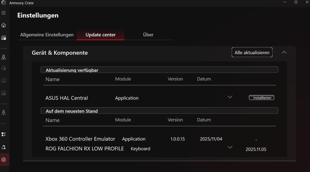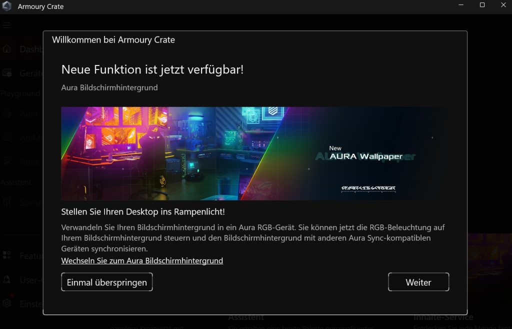 ASUS setzt bei seiner Hardware auf Armoury Crate als Software. Immerhin: Mittlerweile kann ich mich frei entscheiden, welche Inhalte ich mit der Software installiere und kann die ganze Werbung deinstalliert lassen. Am unteren Rand gibt es aber immer noch den Hinweis auf die Feature-Sammlung, was man alles tolles installieren könnte. Ausblenden lässt sich dieser Hinweis nicht. Nervig, aber verschmerzbar.