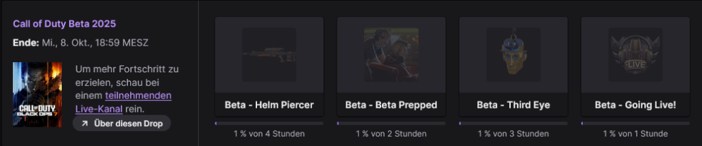 Guten Morgen! Heute startet die offene Beta von Call of Duty: Black Ops 7. Beachtet, dass dies wahrscheinlich erst um 18:00-19:00 Uhr deutscher Zeit geschehen wird. In der Zwischenzeit könnt ihr euch aber schon mal die aktuellen Twitch-Drops sichern. Schaut dazu einem beliebigen Streamer auf Twitch zu, der Drops aktiv hat.