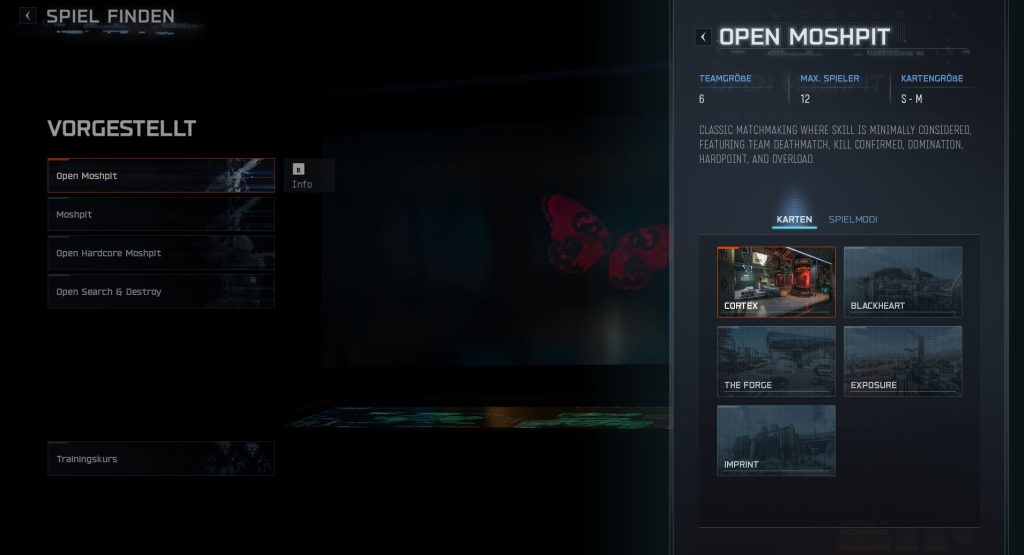 - Open Hardcore Moshpit (NEU) – Klassisches Matchmaking mit minimaler Skill-Berücksichtigung, beinhaltet Team Deathmatch und Herrschaft, Hardcore-Regeln aktiviert.
