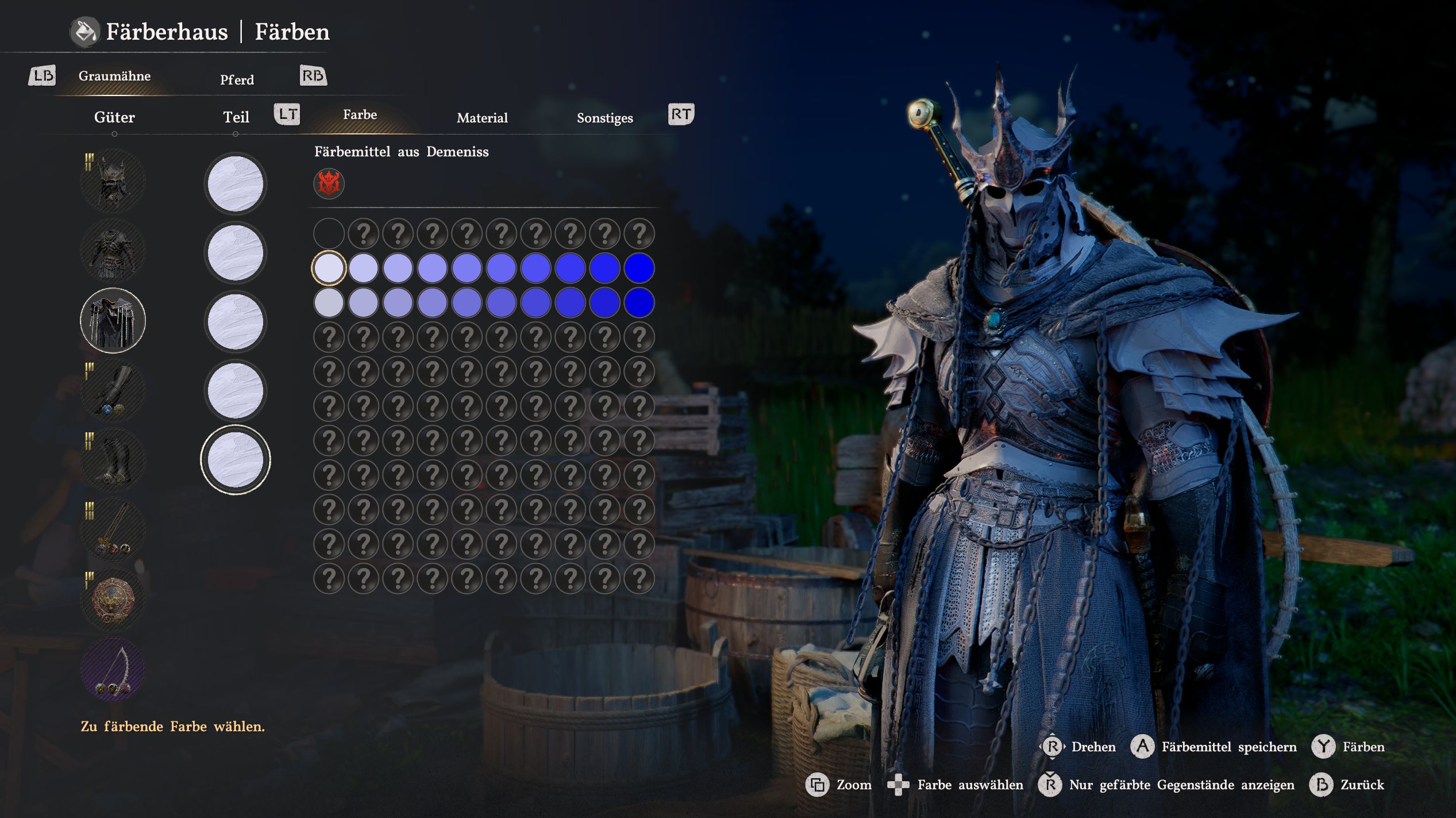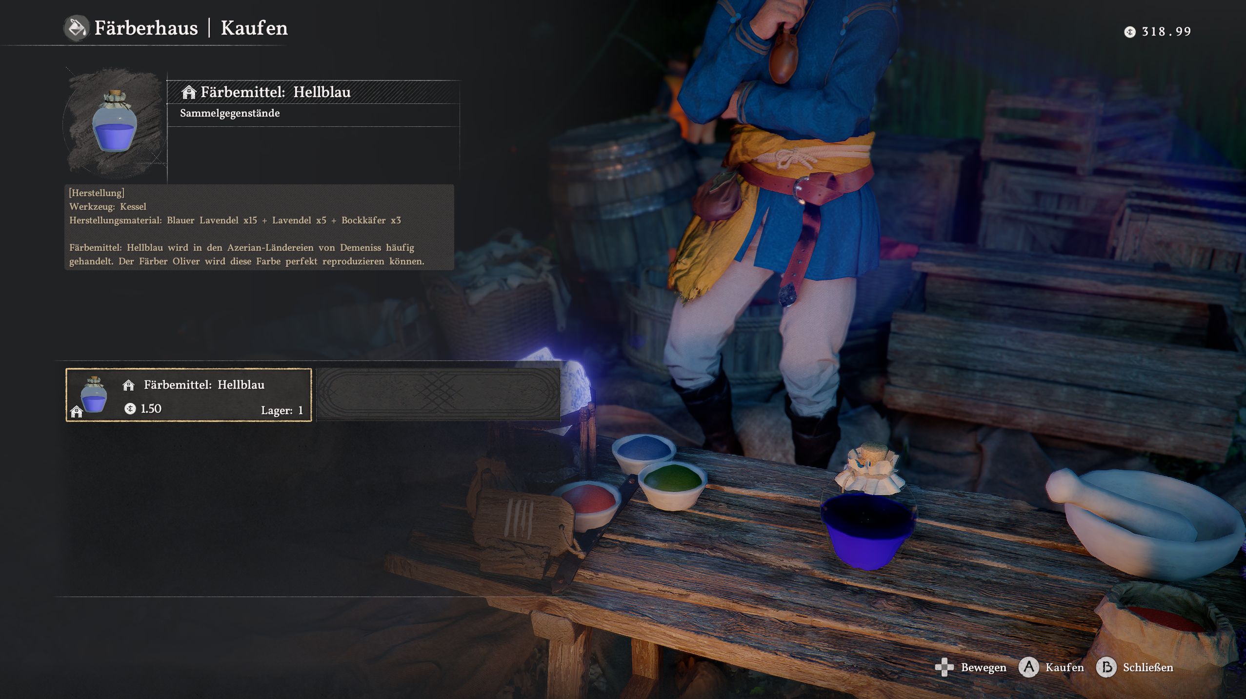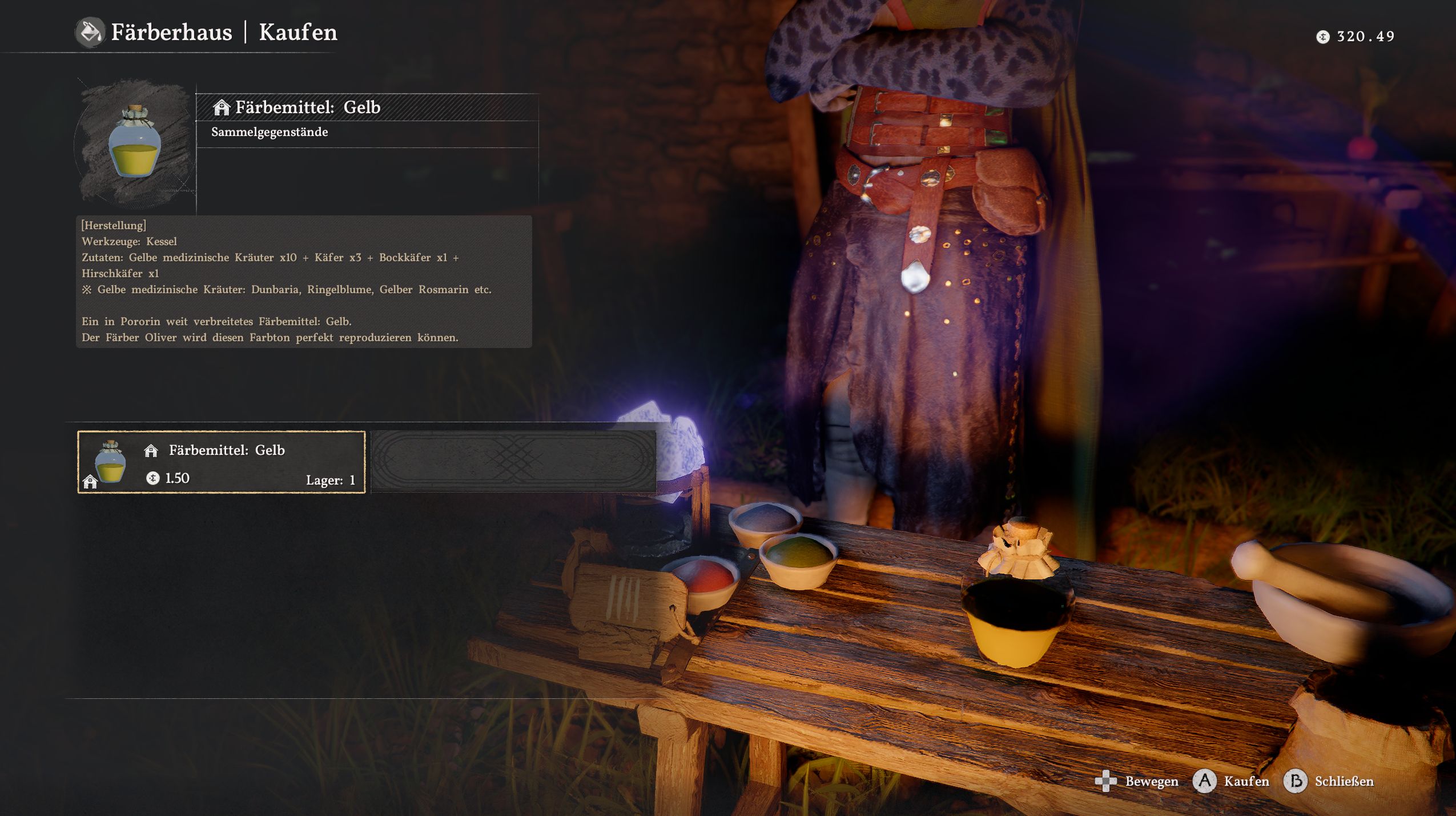 Für beide Farbstoffe bezahlt ihr zusammen gerade einmal 3 Silber. Nachdem ihr sie im Inventar benutzt habt, könnt ihr sie bei den Färbern einsetzen, um eure Ausrüstung farblich anzupassen.