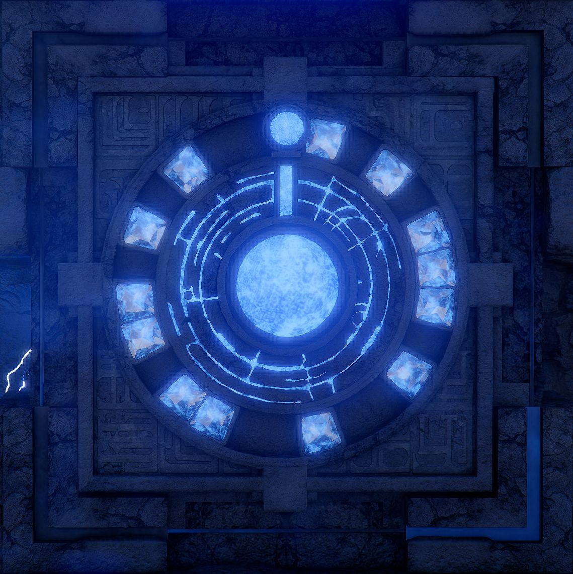 Was ist das für ein Test? An einer Seitenwand jedes Schreins findet ihr einen besonderen Steinquader, in dessen Zentrum ein hellblauer Stein prangt und um den herum kreisförmig weitere weiße Steine angebracht sind. Ein kleiner, blauer Stein über dem Zentrum markiert auf dem äußeren Kreis eine besondere Position.