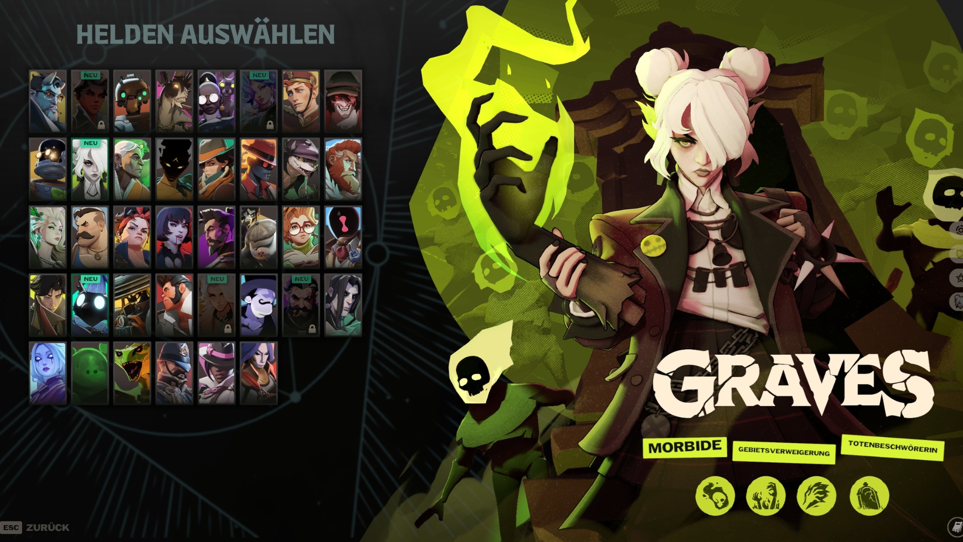 Wer ist Graves? Graves, die Nekromantin, ist mit der Hand eines Untoten bewaffnet. Durch das Sammeln von Todesessenzen kann Graves gleich mehrere fliegende Schädel beschwören, die für sie kämpfen.