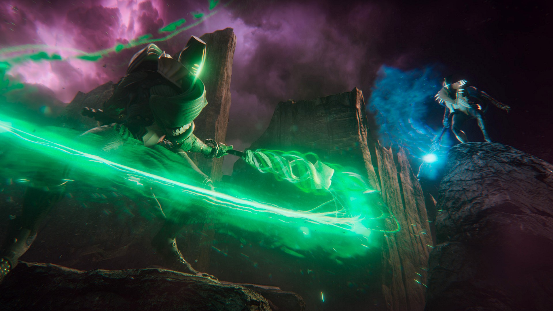 - Ihr werft zuerst drei aufeinanderfolgende riesige Leere-Äxte, um Feinde bei einem Treffer zu zerteilen.