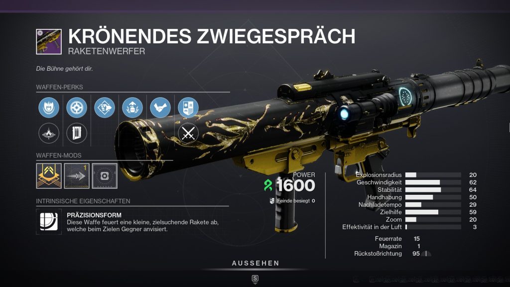 Das kann der Strang-Raketenwerfer “Krönendes Zwiegespräch”: In seinem Aussehen erinnert der neue Strang-Raketenwerfer an dem Gambit-Raketenwerfer “Schlechtes Omen” allerdings offensichtlich mit einem Präzisionsrahmen.