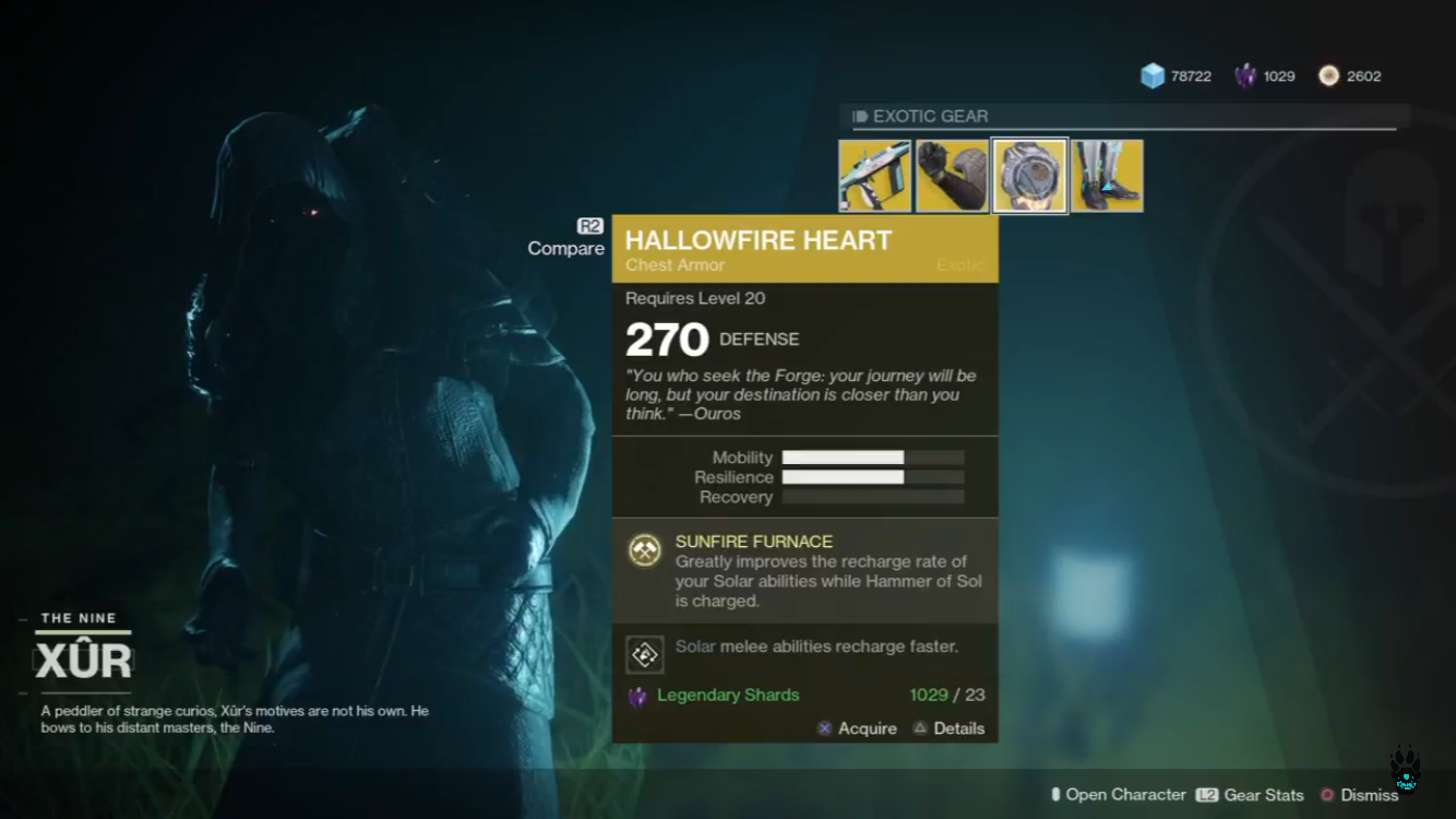 So bringt Xur in Destiny 2 nur noch vier Items mit: Eine Waffe und jeweils ein Rüstungsteil für die drei Hüter-Klassen. All seine Items sind exotisch und gegen Legendäre Bruchstücke zu erwerben.