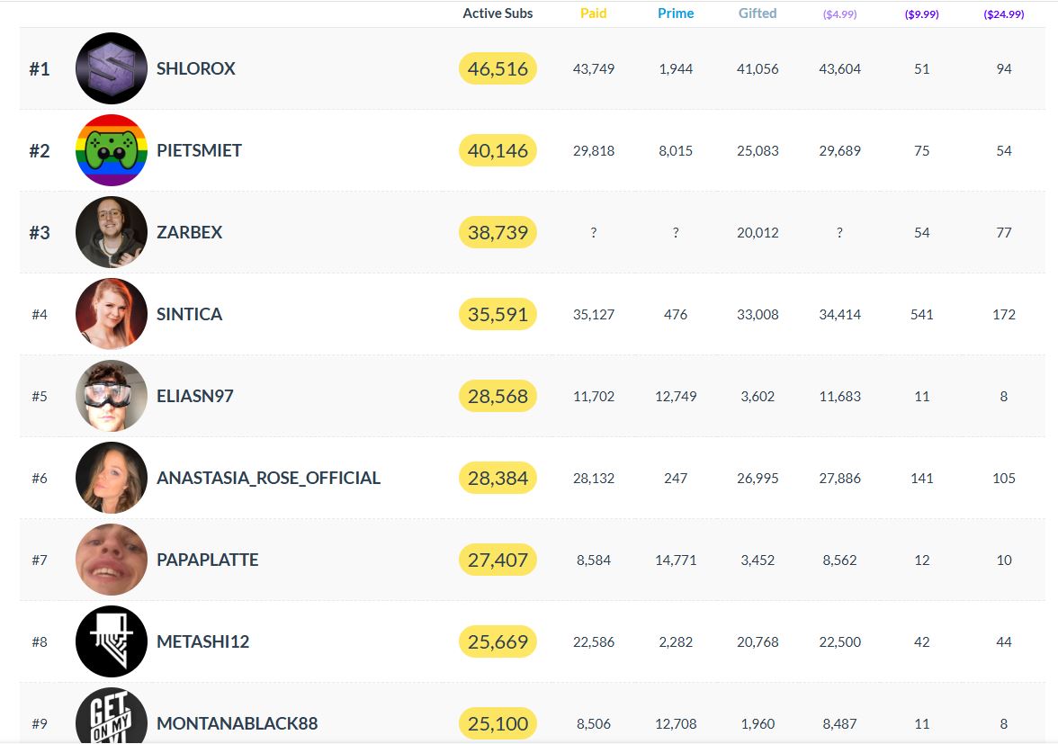 Shlorox ist ein ganz spezieller Fall. Der Streamer hat nur eine relativ kleine Community auf Twitch, die ist aber extrem spendabel. Die letzten 30 Tage liefen jetzt besonders gut für ihn, er ist von Platz 19 hoch auf Platz 6 weltweit, wobei er noch ein gutes Stück von seinem „Allzeit-Höchststand“ entfernt ist.