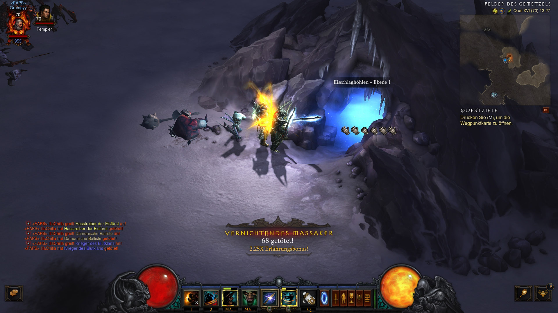 Die Eisschlaghöhlen: Teleportiert euch zur Brücke von Korsikk und betretet von dort die Felder des Gemetzels. Sucht hier nach dem Eingang der Eisschlaghöhlen. Diese durchsucht ihr auf Ebene 1 und Ebene 2.