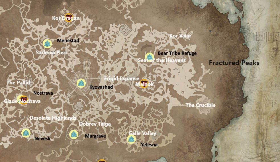 In der Region Fractured Peaks erwarten euch insgesamt 7 Wegpunkte, von denen einer eine Festung ist. Auf der folgenden Map zeigen wir euch die Wegpunkte und beschreiben darunter, ob es Voraussetzungen zum Freischalten gibt.