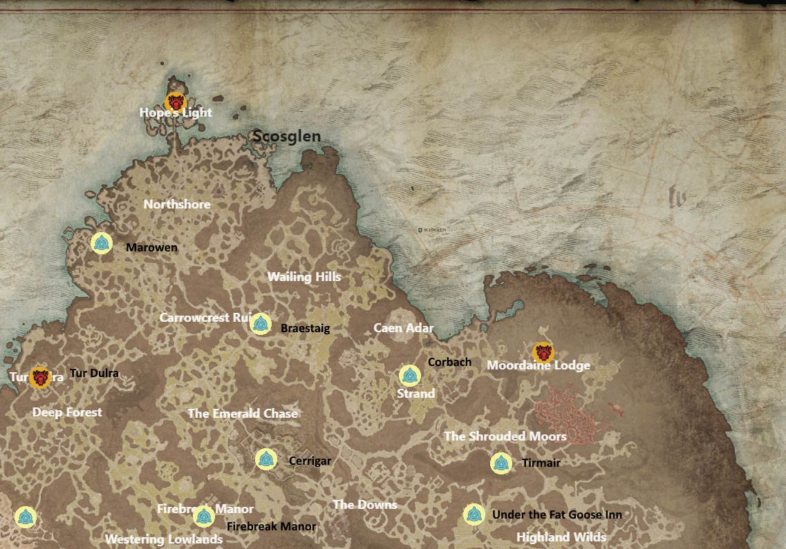 Ihr findet die Region Scosglen im Norden der Map, wo sie sich über ein breites Gebiet streckt. Dort gibt es insgesamt 8 Wegpunkte mit zwei Festungen zu entdecken. Auf der folgenden Map zeigen wir euch die Wegpunkte und beschreiben darunter, ob es Voraussetzungen zum Freischalten gibt.