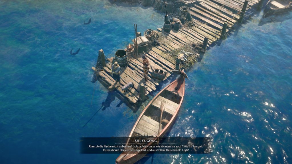 Am Quest-Ort im Süden von Philios trefft ihr auf den mürrischen Angler Shi Yugong, der sich über euren Lärm beschwert. Er fordert euch heraus, selbst einen Fisch zu fangen. Da ihr sofort Erfolg habt, während er den ganzen Tag leer ausging, reagiert er gewohnt schimpfend und schnaubend.