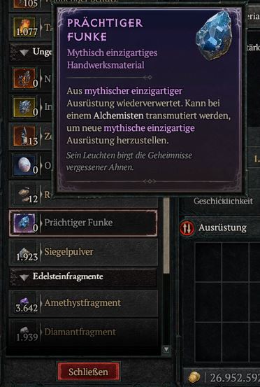 Damit ihr ein Mythic Unique herstellen könnt, benötigt ihr zwei „Prächtige Funken“. Das setzt somit voraus, dass ihr zwei Mythic Uniques gesammelt habt, die ihr zerlegt. Nach dem Zerlegen erscheinen die Funken in euren Materialien.