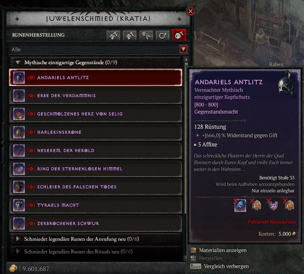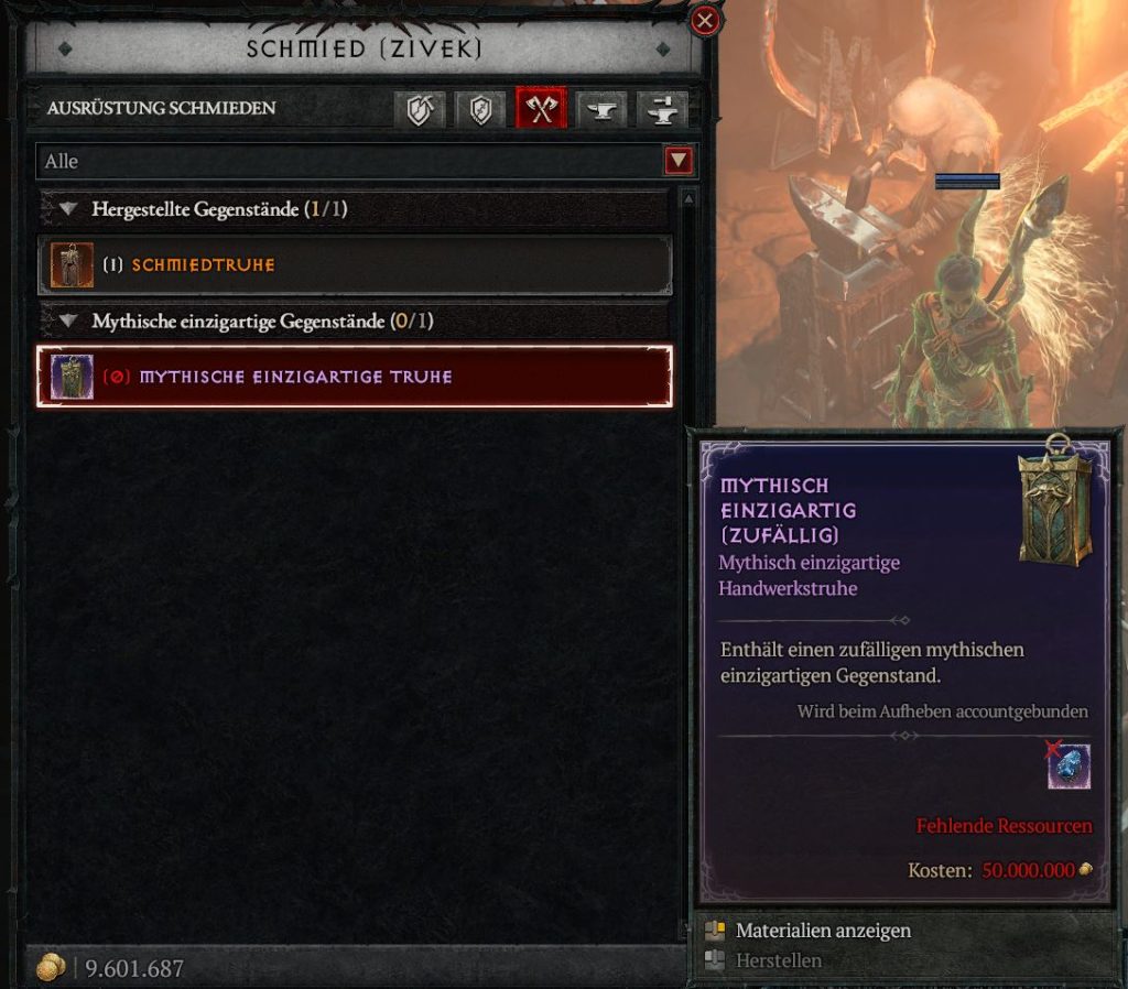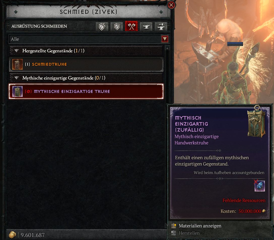 Beim Schmied wählt ihr den Tab „Ausrüstung schmieden.“ Dort könnt ihr euch eine mythische, einzigartige Truhe craften. Bei dem Juwelenschmied könnt ihr im Tab „Runenherstellung“ ein bestimmtes Mythic Unique auswählen. Für jedes Mythic braucht ihr je 6 Stück von drei bestimmten Runen. Details über die Affixe, die die Items haben werden, seht ihr vor dem Craften nicht.