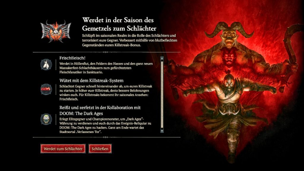 Das bringt Season 12 in Diablo 4: Mit Season 12 ziehen neue Inhalte in Diablo 4 ein. Die neue Season trägt den Namen „Season of Slaughter“ und steht damit ganz unter dem Motto der Schlachtung. Inhaltlich dreht sich buchstäblich alles um blutrünstiges Gemetzel. So könnt ihr euch etwa in den ikonischen Butcher verwandeln und mit Monster-Kills eure Killstreaks in die Höhe treiben. Alle Infos zu Season 12 findet ihr in unserer Übersicht: Diablo 4 Season 12 – alles zu Start, Release Date und dem PTR