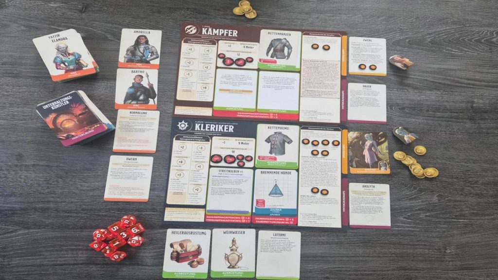 Als Spieler gestaltet sich das Ganze ein wenig leichter, da es pro Charakter ein paar Bausteine gibt, die man sich entlang des Schnellstart-Guides schnell und einfach zusammenpuzzeln kann. Sucht euch eine Klasse aus und schnappt euch den dazugehörigen Charakterbogen. Hintergrund und Volk werden anhand von Karten modular ausgewählt und zum Charakterbogen gelegt. Folgt dann den Anweisungen auf eurem Bogen und legt die nötigen Ausrüstungsteile, Lebenspunkte und euer Gold bereit und dann seid ihr auch schon startklar für eure erste Runde.