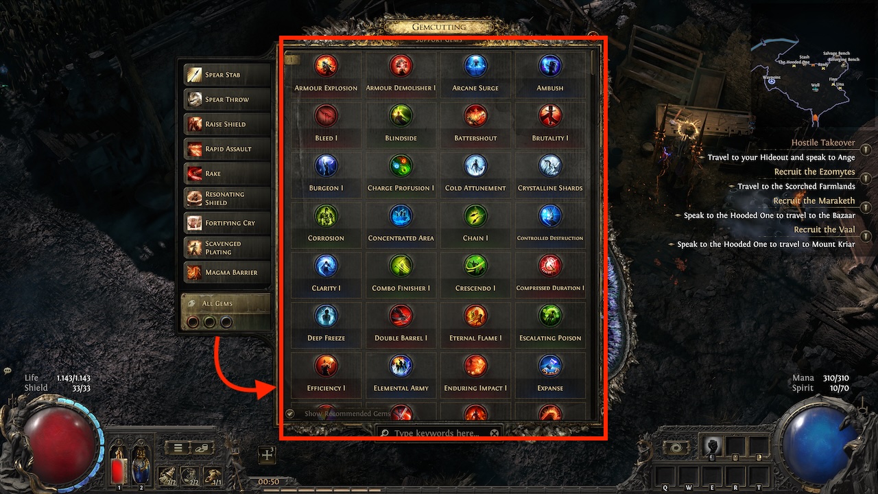 The selection is solid and usually sufficient for completing the campaign, but those who want to survive in endgame must get creative. Besides the suggested options, there are three windows displaying all possible red, green, and blue support gems (on controller, with mouse and keyboard, it’s just one window with “All Gems”).
