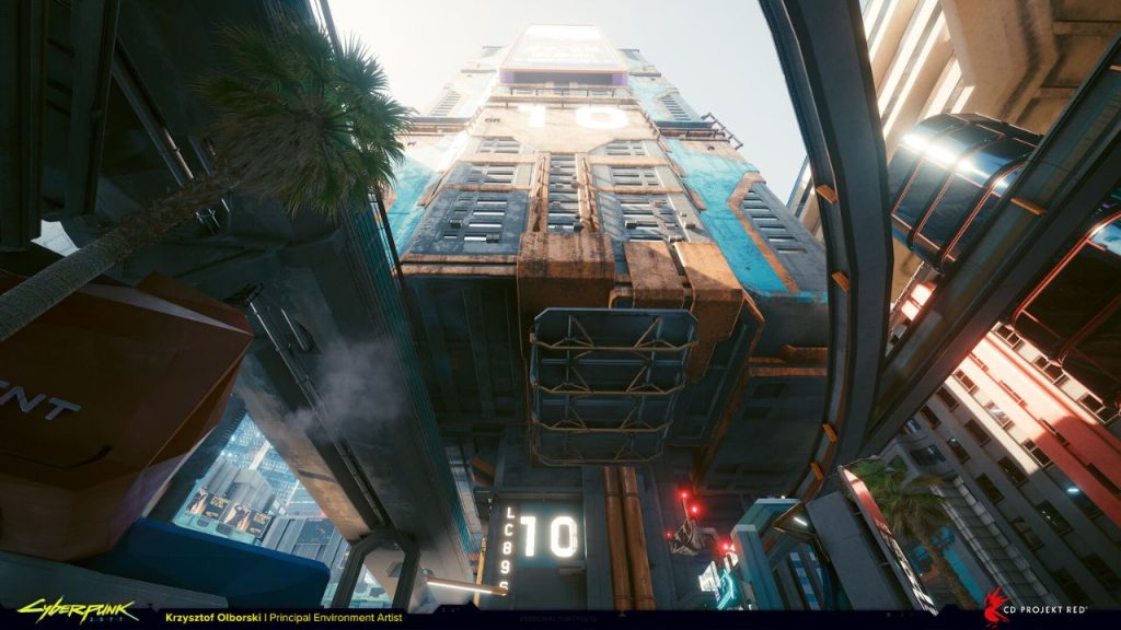 No matter where you are in Night City, instead of a horizon in the distance, you find this at the end of a skyscraper in the sky (if it’s not blocked by streets, flying transports, or screens).