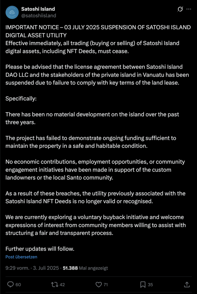 What is the current status? In July 2025, the project itself pulled the emergency brake: In an official statement on X, the Satoshi Island DAO LLC announced that all digital assets – including the NFT plots – are no longer allowed to be traded with immediate effect.