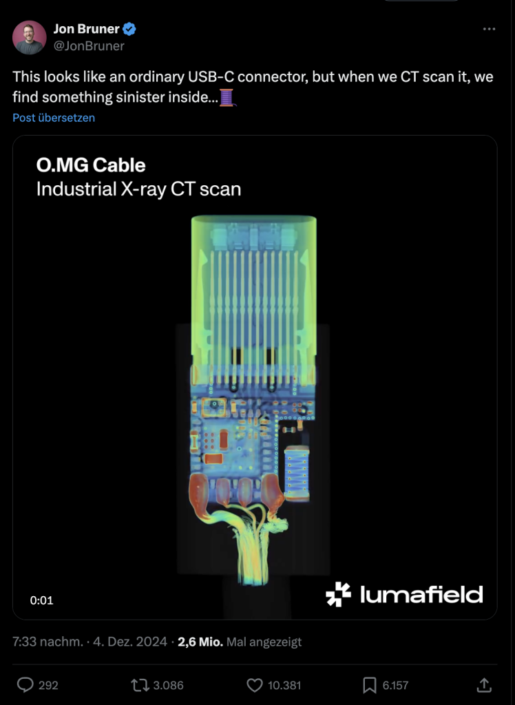 What makes the cable so dangerous? Hackers primarily exploit users’ inattention. USB-C cables are often exchanged among colleagues, friends, or even in public charging stations. This increases the likelihood that a manipulated cable comes into one’s possession or is used for a conventional data transfer.