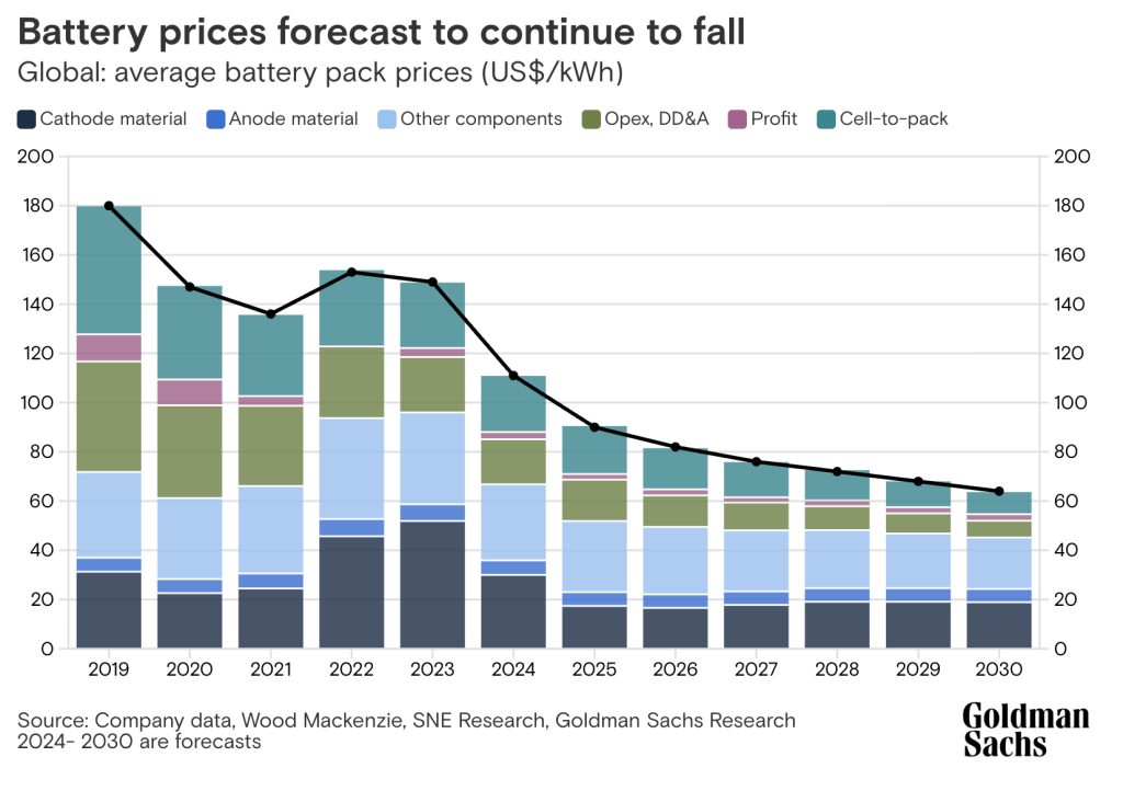 However, according to new forecasts, this problem with modern electric cars could soon be resolved, as calculated by Recurrent in 2024 for the first time. The basis for this is price forecasts from Goldman Sachs, which already predicted a drop in battery prices of up to 50% by 2030.