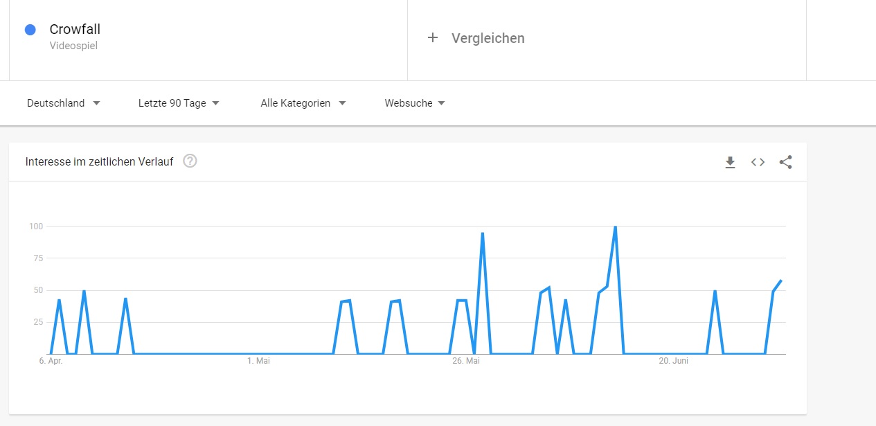 How big is the interest in Crowfall at the moment? Essentially, hardly anyone is interested in the game. According to Google Trends, interest peaked in 2016 when many still had high hopes for Crowfall. In the last 90 days, however, there has been almost no search activity for the new MMORPG. Only yesterday and today did the trend rise slightly: