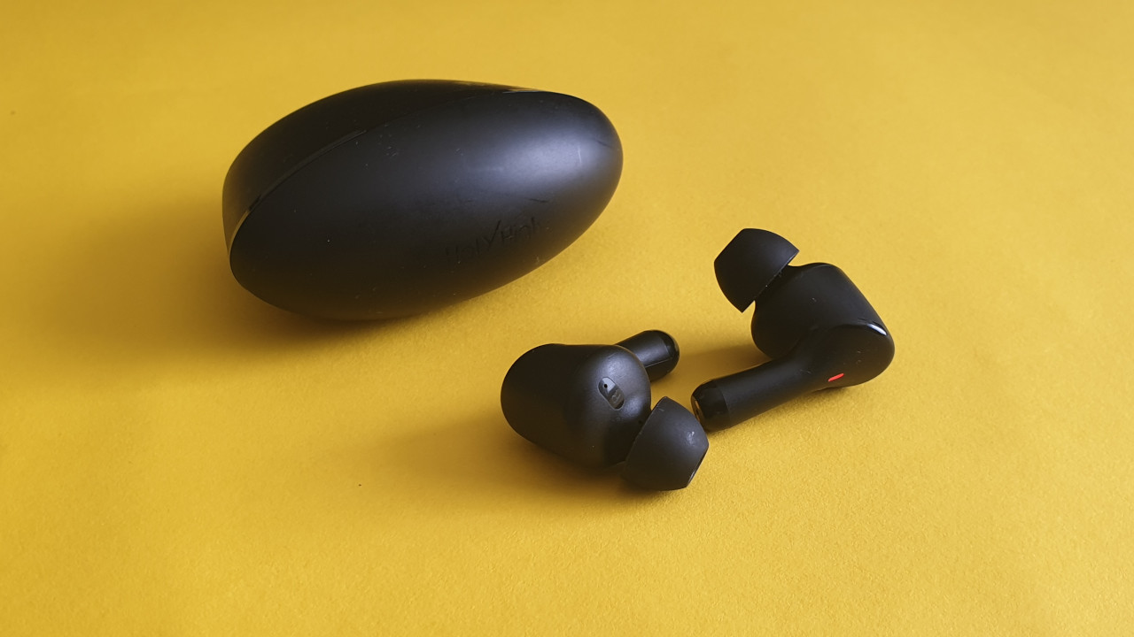 The charging case is made of plastic and feels cheap. Fingerprints and fine scratches can also be easily seen. The lid is attached to the case with a plastic clasp.