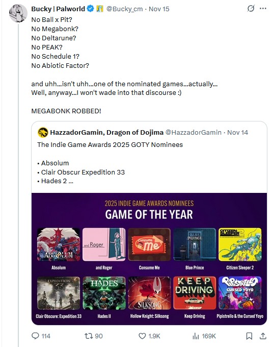 The community director of Palworld, who appears online under the name Bucky, lamented in a post on X the absence of titles like Ball x Pit, Megabonk, Peak, or Schedule 1. Later, he clarified that it was actually more of a joking way to celebrate the strong indie year, but in the comments, some fans are genuinely upset. Half of the games seem too big for some to qualify for an indie award, while they haven’t heard anything about the others.
