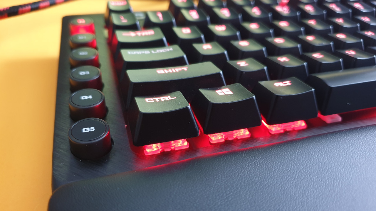 In practice, the keyboard is well-suited for gaming, especially fast-paced games like Apex Legends. The keys are responsive, and the hands rest comfortably on the wrist rest. The macro keys on the left side are overall positioned a bit too low, and the mute button is placed somewhat far at the upper right corner.