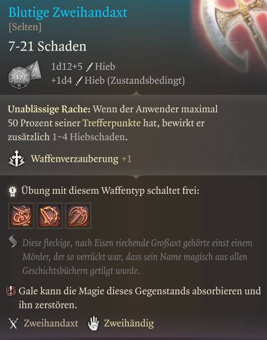 It inflicts slashing damage, and if someone who is proficient with two-handed axes wields it, the damage is increased. If your hit points drop to 50%, you inflict additional damage.