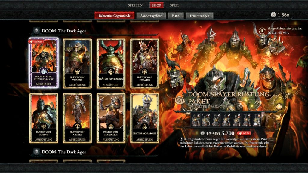 How expensive are the skins? It depends on how much you want to buy. A special DOOM armor set for a single class costs about 25 euros, and it can only be used by that class. Alternatively, there is a large bundle for all seven classes at the price of 5,700 platinum (about 50 euros).
