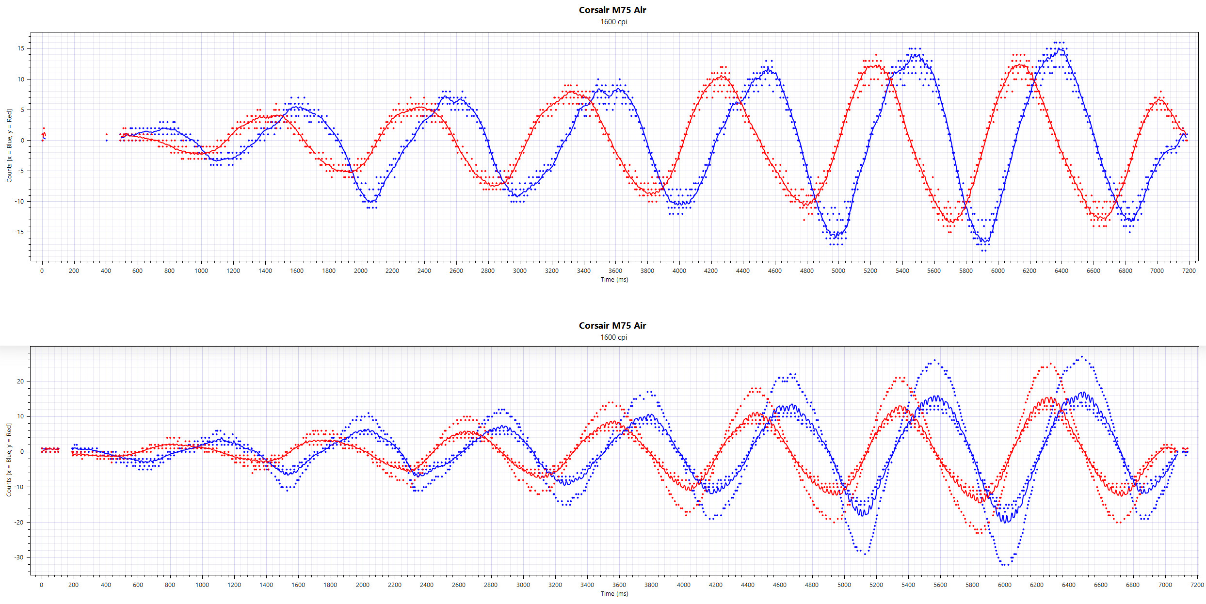 The 5G sensor from Razer is still more accurate and precise than Corsair’s Marksman model. The same goes for Roccat’s older Owl-Eye sensor in the Burst Pro. I have embedded the comparison to the Burst Pro above. You can see that the measurement points are closer to the curve than with Corsair.