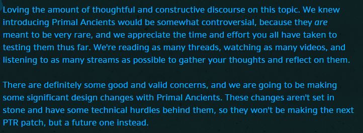 The Blizzard team was aware that the introduction of archaic items would be somewhat controversial due to their extreme rarity. According to Nevalistis , there are good and justified concerns. Due to the feedback, there will be significant design changes to the archaic items. However, these changes are not set in stone. Since there are still technical hurdles to overcome, these changes will not be included in the next PTR patch but at a later time.