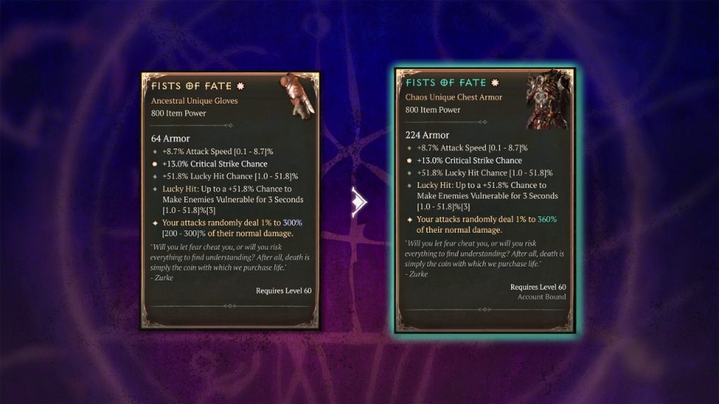 This is what the new Uniques are about: The new Chaos Armor is a stronger version of already existing Uniques. They drop for different item slots, creating new possibilities for builds and playstyles. However, you can only equip one version of a Unique and thus cannot combine the normal version with the Chaos version.