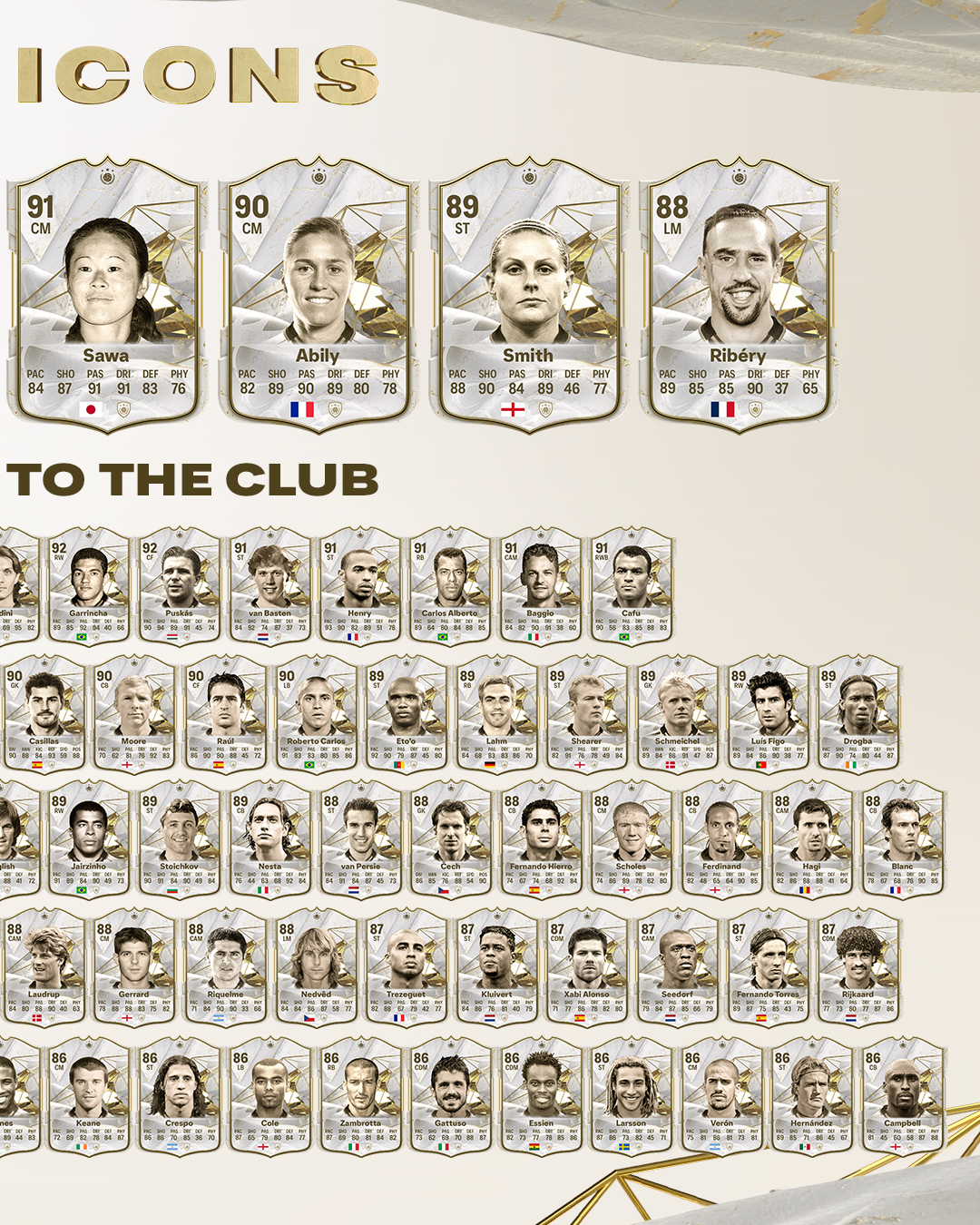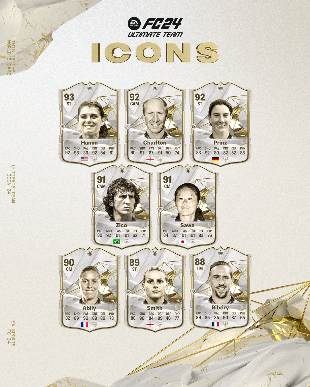 These are the new icons for FC 24: The new icon cards are led by the American Mia Hamm (93), who offers a very strong card. The two-time world champion has a 93 rating and extremely strong stats, which will likely lead to a high price on the transfer market.
