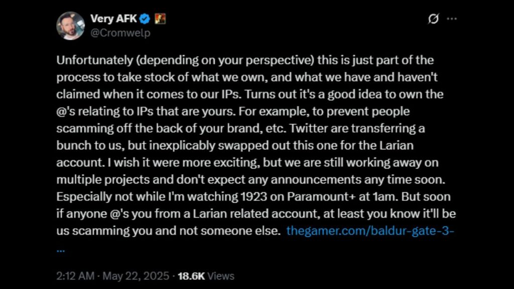 Unfortunately (depending on your perspective), this is just part of the process of taking stock of what we own and what we have claimed regarding our IPs and what not. It turns out it’s a good idea to own the @s that relate to your own IPs. For example, to prevent people from scamming with your brand, etc. Twitter is transferring a bunch of those to us but inexplicably exchanged this one with the Larian account. I wish it were more exciting, but we are still working on multiple projects and do not expect any announcements anytime soon. Especially not while I’m watching Paramount+ at 1 a.m. in 1923. But if someone reaches out to you from a Larian account soon, at least you know it’s us scamming you, not someone else.