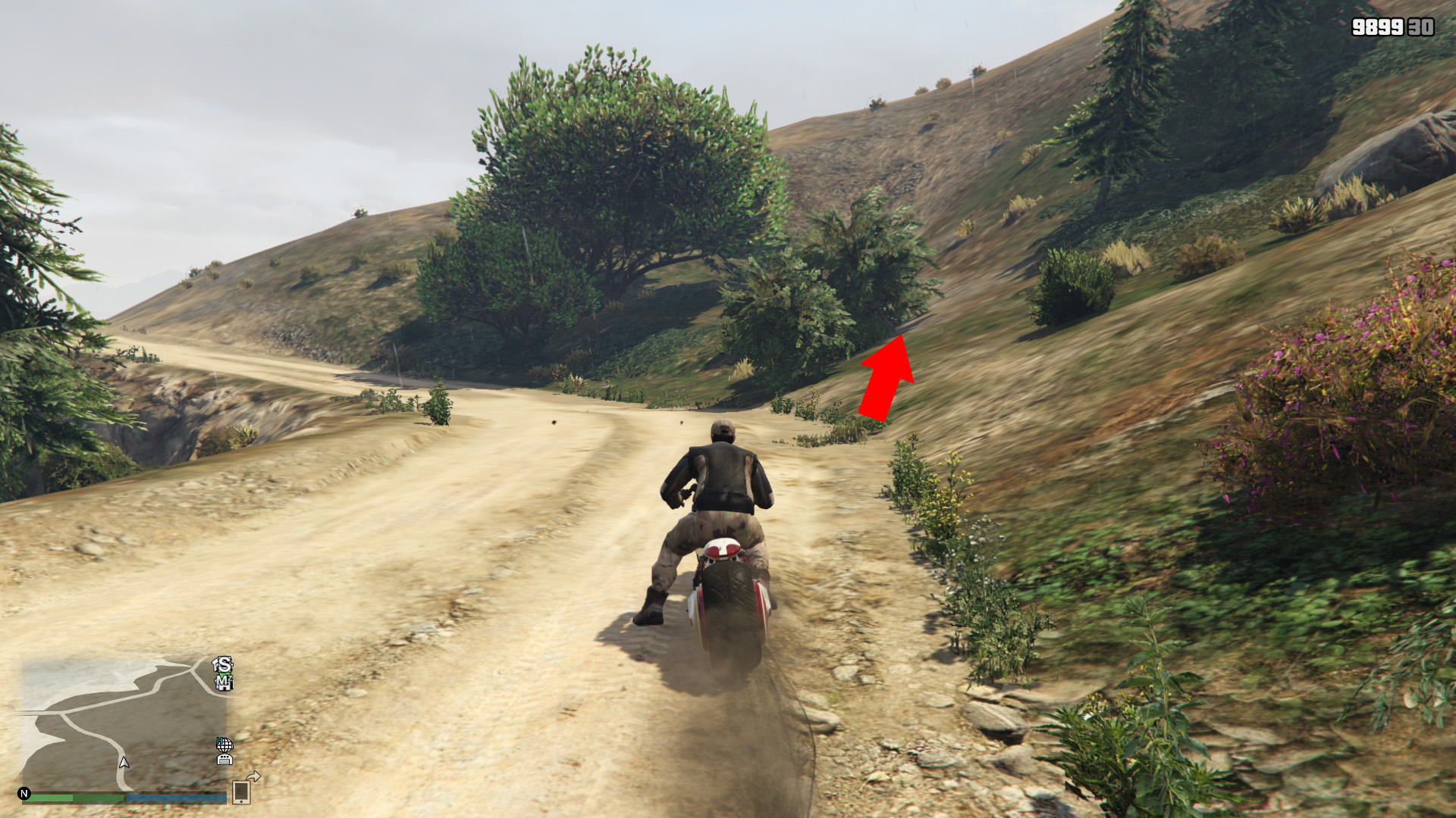 You will follow this track until you see the red exclamation mark at the top of the map. Instead of following the path there, you speed straight up the mountain and down on the other side. Or you jump over the mountain.