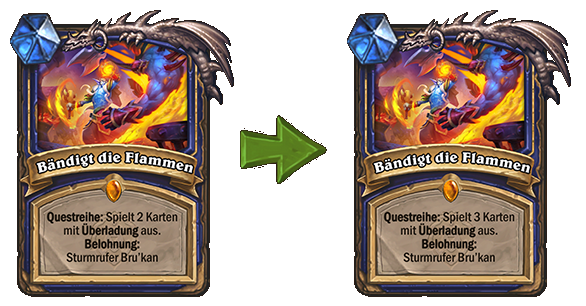 The final quest step “Tame the Flames” will be slightly harder to complete. Instead of 3 overloaded cards, the Shaman will now need to play 3 overloaded cards to access Stormcaller Bru’kan.