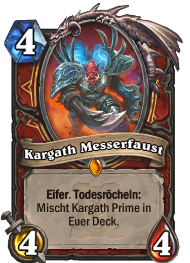 Kargath Messerfaust is the legendary minion for Warriors. For 4 Mana, he has stats of 4/4 and charge. His deathrattle shuffles Kargath Prime into the deck, a 10/10 minion for just 8 Mana with charge. But that’s not all. Every time Kargath Prime attacks and destroys another minion, its owner gains 10 armor.