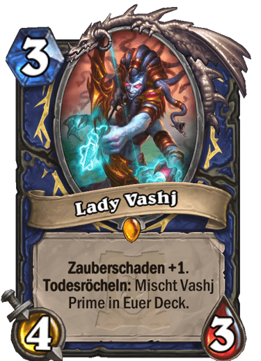 Lady Vashj is a new minion for Shamans. She also costs 3 Mana, has stats of 4/3, and an additional spell damage +1 as a passive effect. When she dies, Vashj Prime is shuffled into the deck – a new minion for 7 Mana with stats of 5/4 and also spell damage +1. As a battlecry, she additionally has: “Draw 3 spells. Reduce their cost by (3).” Shamans, primarily focused on powerful spells, should take note of Vashj.