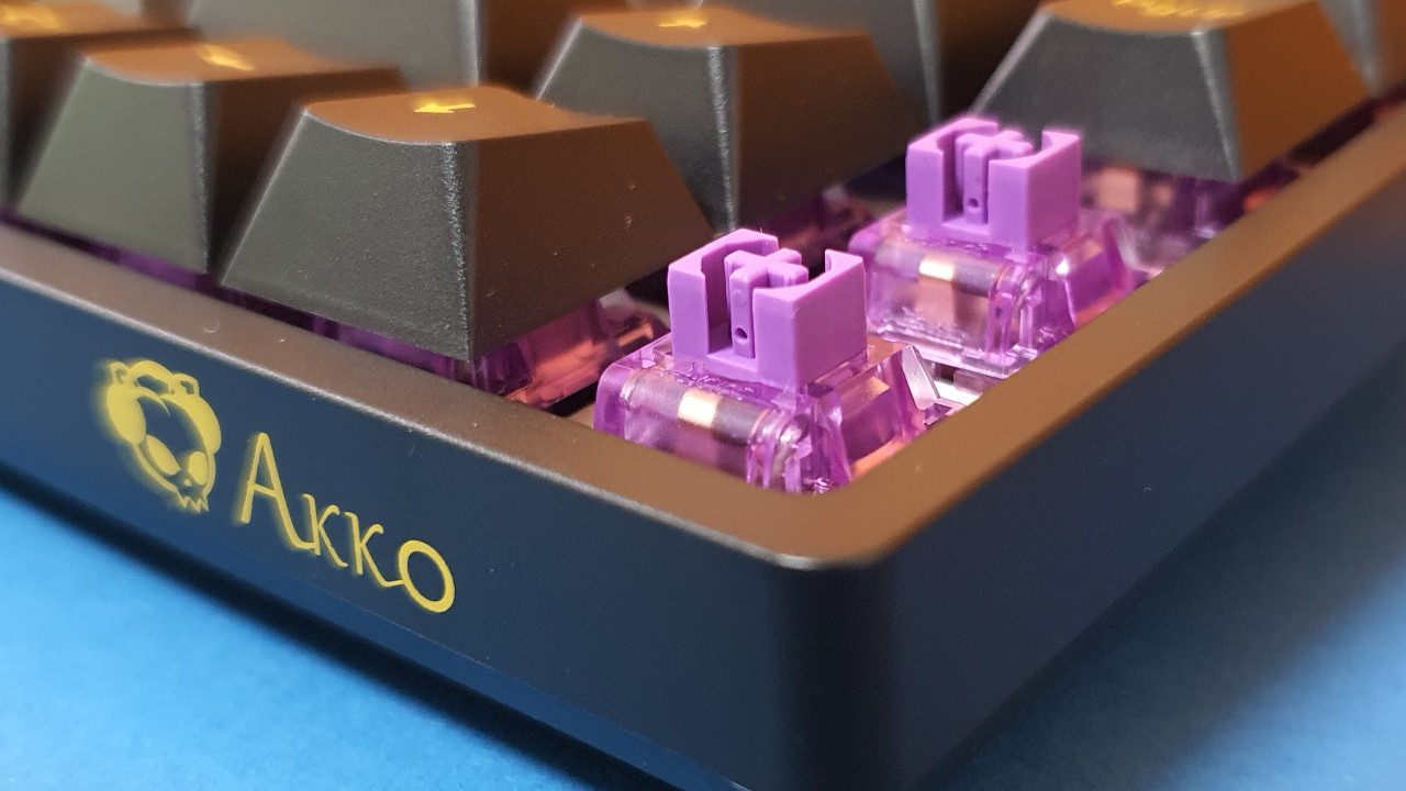 Under the keycaps of my keyboard are “Jelly Purple” switches from Akko. Akko’s purple switches are strongly based on brown switches, such as those from Gateron. The purple switches are the successor to the “Lavender Purple” switches, which I will not go into detail about here, as they have mainly been detail adjustments.