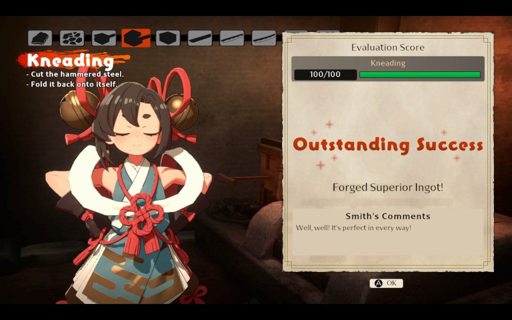 You can exchange caught fish for the different in-game currencies, buffs for your Kagura’s staff, or materials. With those, I can forge, including a crash course in traditional Japanese blacksmithing, where the process is explained step by step. This way, I craft my own sword according to my ideas with bonuses and appearance.