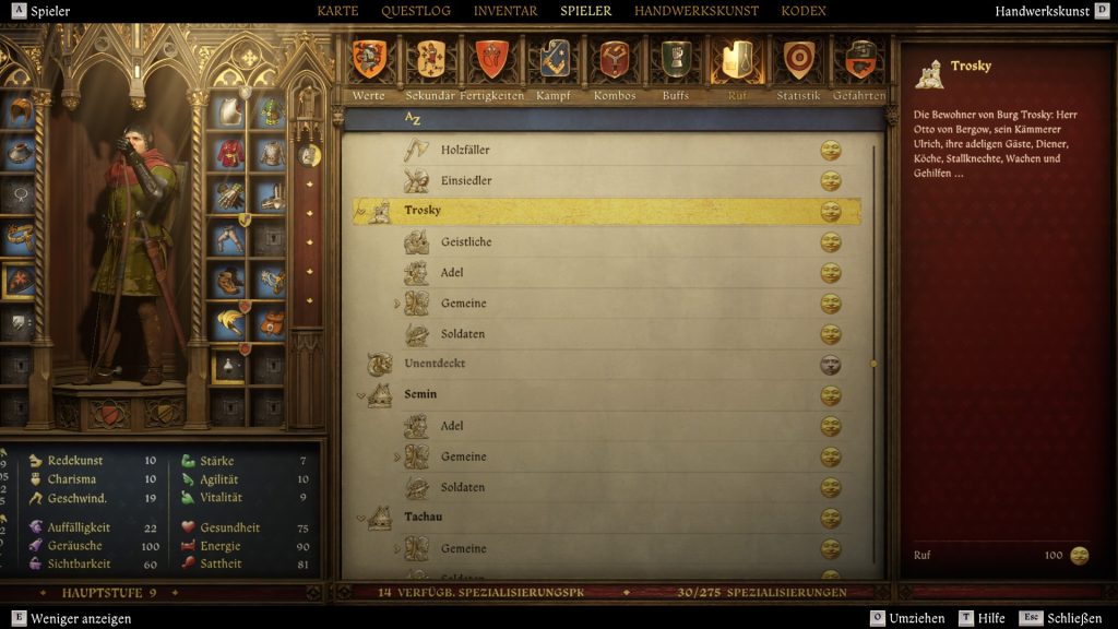 What is the reputation system? Every region in medieval Bohemia that you can explore has its own opinion of you. All NPCs and quests located in that region influence your reputation. You should keep an eye on your reputation, as it directly affects how NPCs interact with Heinrich.
