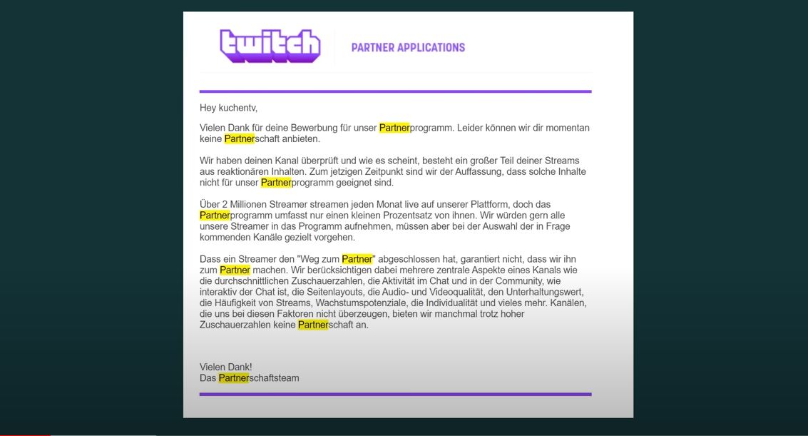 Why doesn’t kuchen.tv get a partner contract? One can only speculate. It is probably not the case that Twitch assigns someone 30 hours to thoroughly review and evaluate Kuchen.tv’s entire body of work over the years in a partner application.