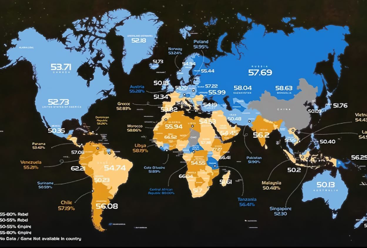 - The north tends to lean towards the Empire: As an outlier, one can see Russia, where almost 58% choose the Empire.