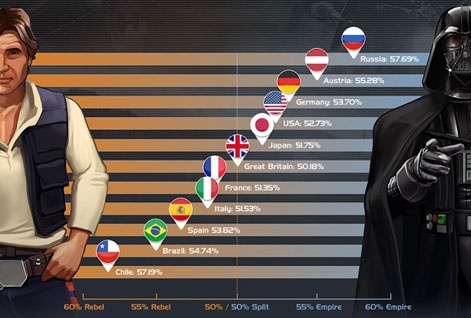 - At the release of the game, it quickly gathered 5 million players. Lucas Games evaluated in September 2014 how the player base is distributed by country: Do more choose the Rebels (yellow) or more choose the Empire (blue).