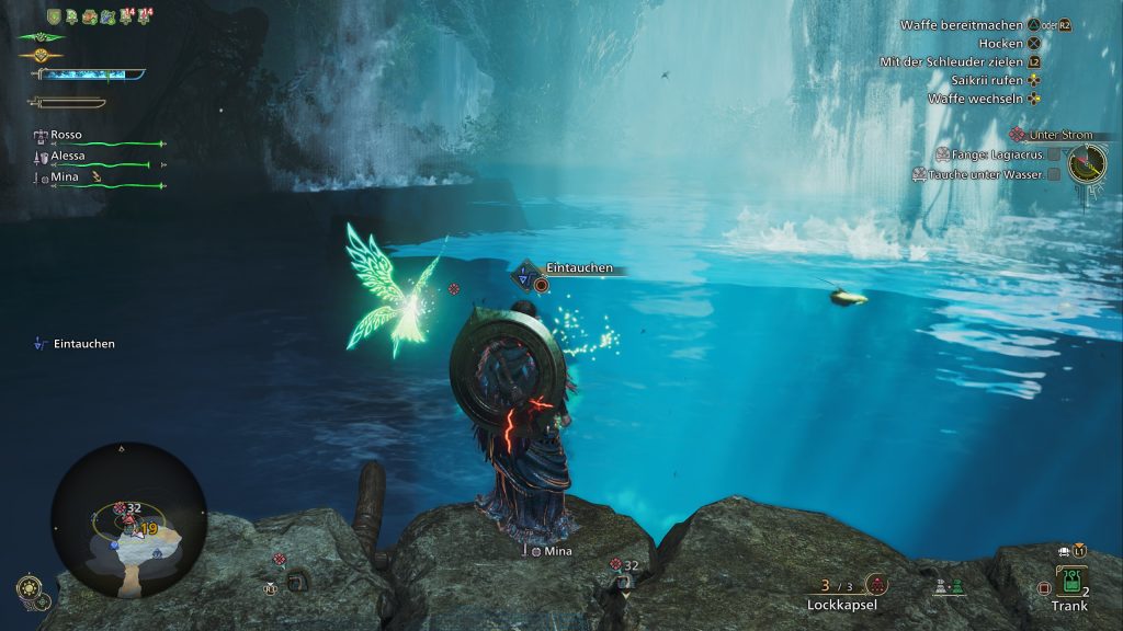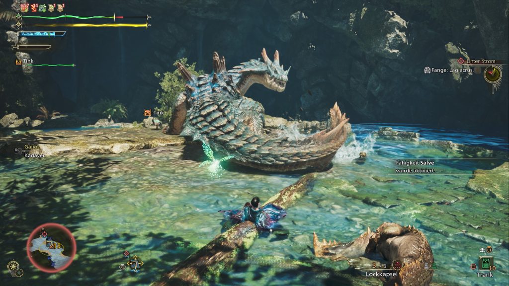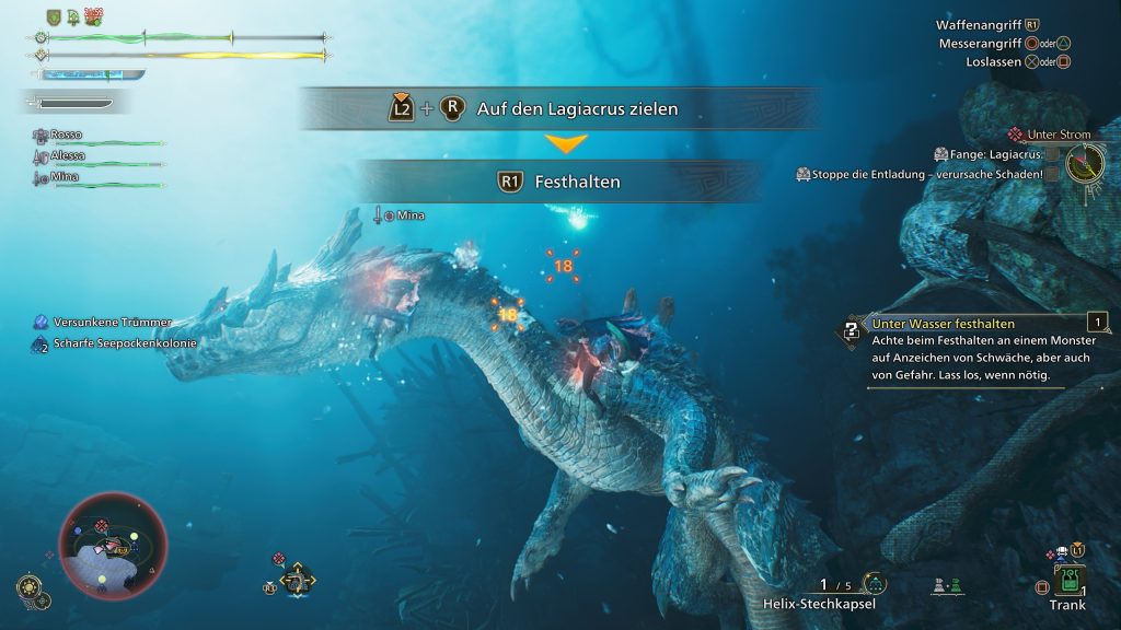 - Interact with your grappling hook at special spots (here “Sunken Debris”) and deal high damage to the monster in front/under it