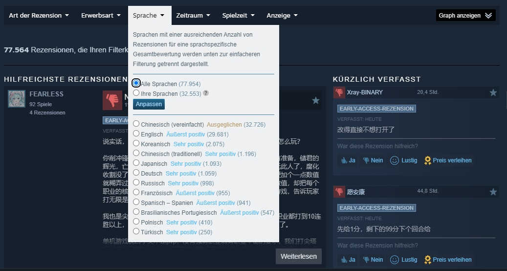 The vast majority of the recent negative reviews were written in simplified Chinese – so they most likely come from China. You can see this at a glance when filtering the reviews by language. The Chinese reviews are only “Mixed” (59 %), while the English ones are “Overwhelmingly Positive” (95 %).