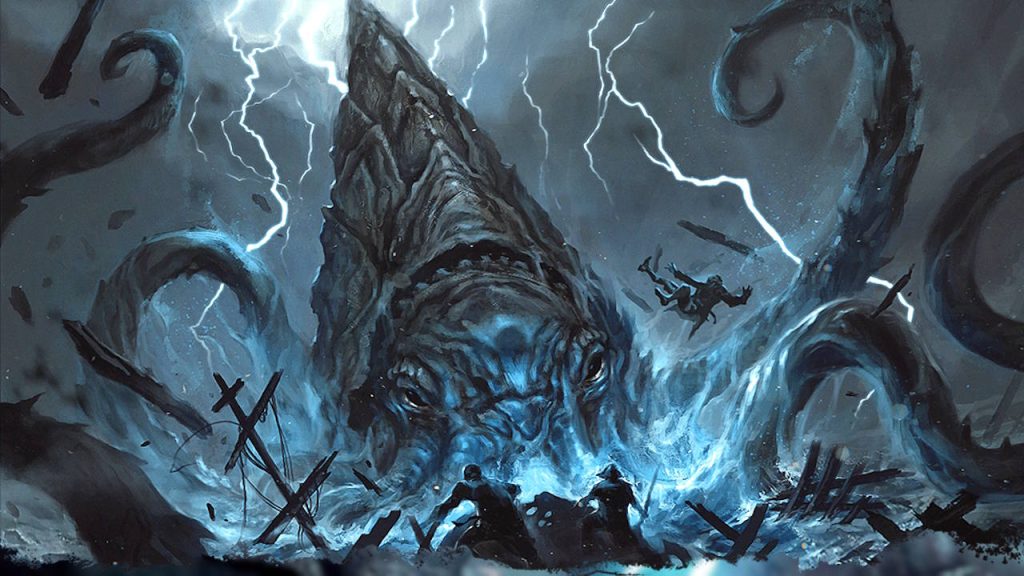 Kraken are ancient war machines of the gods that slumber in the deepest oceans until their time comes to dominate the world. With enormous tentacles, they crush ships and towers while unleashing storms to strike their enemies with lightning. Once created by gods to wage forgotten wars, most remain in the sea until summoned again.
